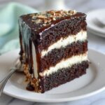 - Finish Cake: Pour the chocolate ganache over the frosted cake, allowing it to drip down the sides. Sprinkle the sliced almonds over the top for added texture and almond flavor. Let the ganache set before serving.