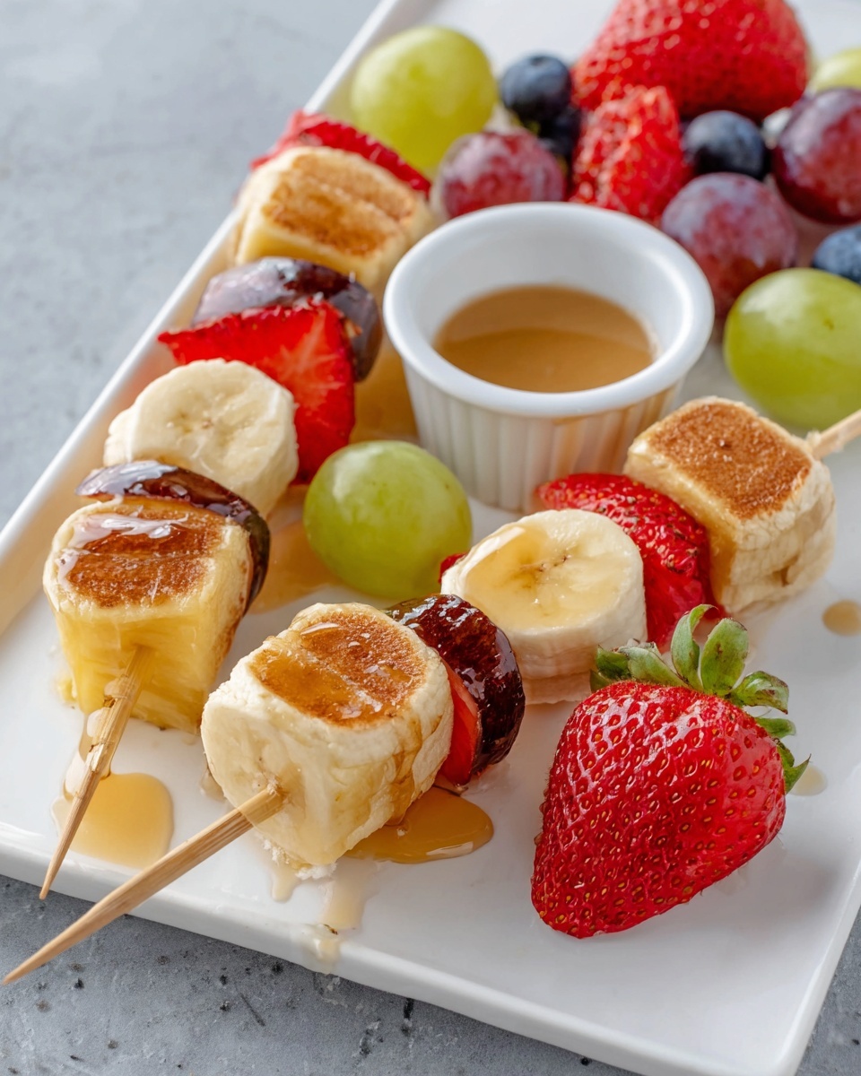 - Serve: Arrange the completed kabobs on a serving platter. Serve them alongside the chilled maple fruit dip for dipping. Enjoy immediately for the best freshness and flavor.