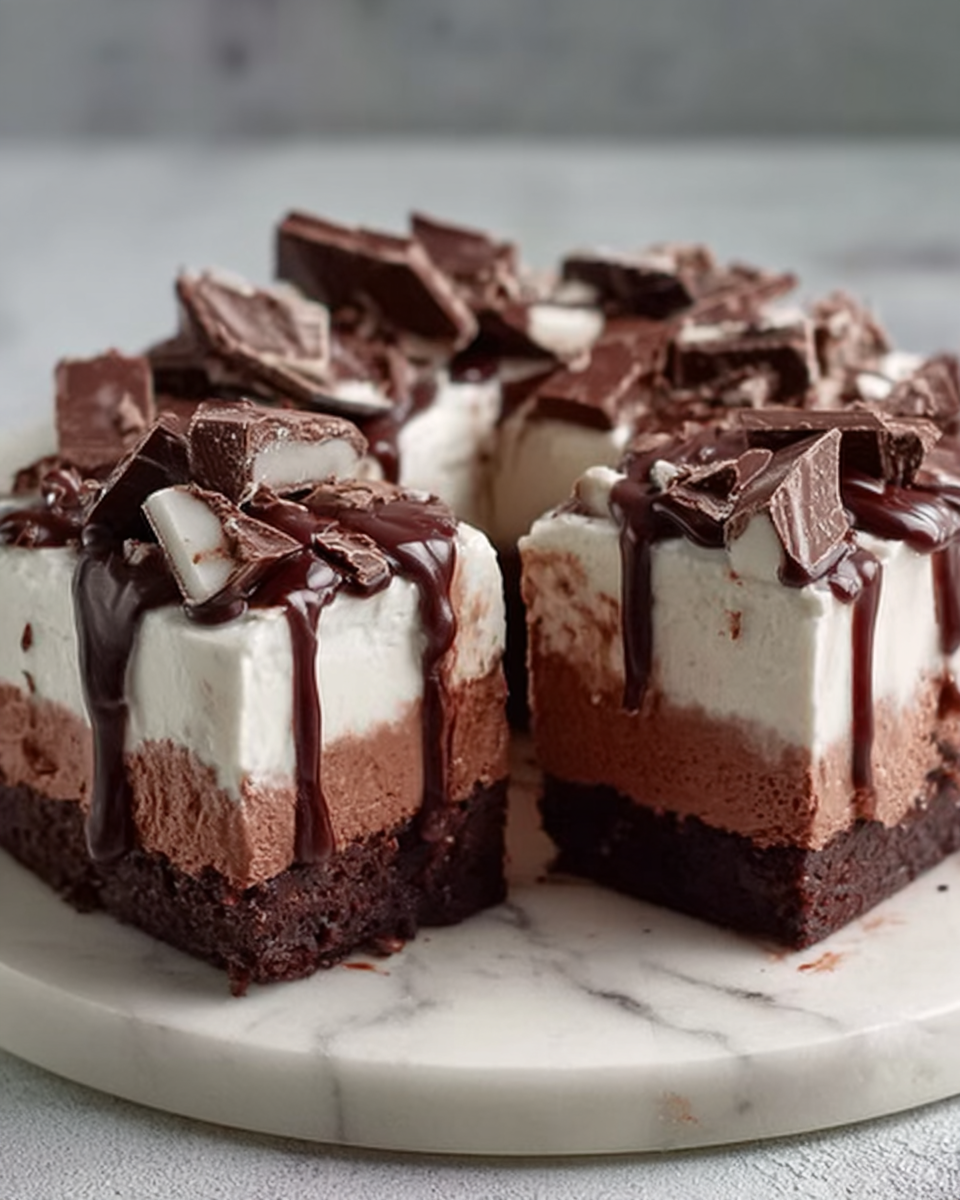 10. Add Toppings and Serve: Remove the cake from the freezer and top with whipped cream, chocolate syrup, and optional sprinkles or chopped nuts as desired. Cut into squares and serve immediately for the best texture and flavor.