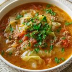 A hearty and comforting Cabbage Soup featuring ground beef, aromatic onions, garlic, and fresh vegetables simmered in savory beef broth. This easy-to-make, nutritious soup is perfect for a warming meal that serves six.