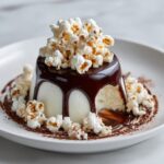 Place your large vanilla ice cream dome on a pretty serving plate to make presentation a breeze. Generously pour the cooled caramel sauce over the dome, letting it drip all over the sides creating an inviting glossy coat. Then, gently press popcorn onto the dome’s surface, sticking it firmly to the caramel layer. This adds both texture and a playful appearance. Finally, sprinkle chunks of dark chocolate over the popcorn layer, giving bursts of bittersweet flavor amidst the crunch and cream. This step is where magic happens, transforming simple ingredients into an irresistible spectacle.