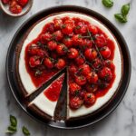 While the cheesecake chills, toss the halved cherry tomatoes with olive oil, balsamic vinegar, honey, salt, black pepper, and optional chili flakes for a touch of heat. Roast them in a 355°F (180°C) oven for about 30 minutes until soft and caramelized. Once roasted, gently mash the tomatoes to form a rich, jam-like consistency that beautifully contrasts the creamy cheesecake. Spoon this vibrant jam on top just before serving for a burst of fresh, sweet, and tangy flavor.
