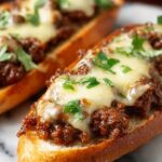 These Cheesy Garlic Bread Sloppy Joe Melts combine the rich flavors of classic sloppy joes with gooey melted cheeses on a garlic butter toasted Italian bread. Perfect as a quick, satisfying meal, this recipe features seasoned ground beef simmered in a tangy ketchup and mustard sauce, loaded onto crispy garlic bread and topped with mozzarella and sharp cheddar cheeses. Garnished with fresh parsley, it’s an irresistible comfort food that comes together in just 25 minutes.