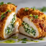 Place each chicken breast between two sheets of parchment paper and gently pound them with a meat mallet until they reach about half a centimeter thick. This creates a uniform thickness, ensuring even cooking. Season both sides lightly with salt and freshly ground black pepper to enhance the chicken’s natural flavor, setting the stage for the rich filling.