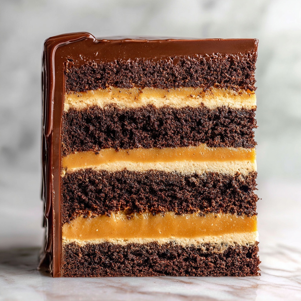 - Assemble Cake Layers: Place one cake layer on a serving plate. Spread a layer of peanut butter frosting over it, followed by a layer of peanut caramel. Repeat with remaining cake layers, chilling if needed for easier stacking.