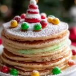 Celebrate the holiday season with these festive Christmas Pancakes, stacked and decorated to resemble a charming Christmas tree. Fluffy and tinted green with food coloring, these pancakes are adorned with whipped cream, sprinkles, and candies for a delightful and visually stunning breakfast treat that’s perfect for family gatherings.