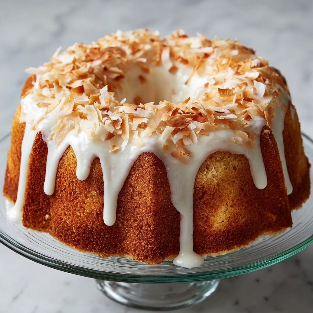 This Coconut Bundt Cake is a moist and flavorful dessert featuring shredded sweetened coconut and rich coconut milk. Baked to perfection in a Bundt pan, it offers a tropical twist with a smooth coconut glaze and optional toasted coconut topping, making it a delightful treat for any occasion.