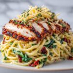 Serve the chicken sliced into strips over the pasta in an elegant bowl for an impressive presentation. Alternatively, build a layered plate with pasta as the base, topped with chicken and sprinkled with greens and cheese for a rustic yet stylish look.