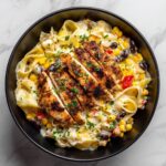 This Creamy Southwest Chicken Alfredo combines tender seasoned chicken breasts with a rich, cheesy sauce infused with southwest flavors like chili powder, smoked paprika, cumin, and green chilies. Served over perfectly cooked fettuccine pasta with added corn and black beans, this dish offers a hearty and flavorful twist on classic Alfredo, garnished with fresh cilantro and a hint of lime for brightness. Ideal for a comforting weeknight dinner that brings bold Tex-Mex flair to traditional Italian creaminess.
