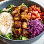 Evenly spoon the tomato-cucumber mixture over the proteins, then add a generous dollop of creamy hummus on the side of each bowl. Finish by drizzling your choice of tzatziki or tahini sauce across the top, infusing the dish with cooling, tangy flavors that elevate the entire experience.