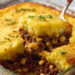 - Assemble Casserole: Spread the beef mixture evenly in the prepared baking dish. Pour the cornbread batter evenly over the top of the beef layer and spread it with a spatula.