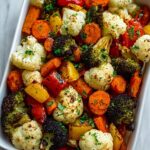 This Garlic Roasted Vegetables recipe features a vibrant medley of carrots, bell peppers, zucchini, red onion, and broccoli, perfectly roasted with garlic, thyme, rosemary, and a touch of balsamic vinegar for a flavorful, healthy side dish. Perfectly tender with golden edges, this easy vegan recipe adds a nutritious and delicious element to any meal.