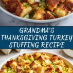 Grandma’s Thanksgiving Turkey Stuffing is a classic, savory side dish made with hearty French bread cubes, sautéed onions and celery, and seasoned with poultry spices. This comforting casserole bakes to a golden, crispy perfection, making it the perfect accompaniment to your holiday turkey feast.