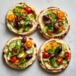 - Add the Salad Topping: Spoon the prepared Greek salad mixture over the hummus-covered naan rounds, distributing evenly among all pieces.