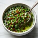 This vibrant and versatile homemade chimichurri sauce is a fresh Argentinian condiment made with finely chopped parsley, garlic, red wine vinegar, and olive oil. Perfect as a zesty topping for grilled meats, a marinade, or a flavorful addition to sandwiches and salads, it is quick to prepare and packed with fresh herbs and bold flavors.