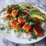 This vibrant Honey Garlic Salmon Rice Bowl combines tender coconut-infused basmati rice, succulent honey garlic glazed salmon cubes, and a refreshing cucumber avocado salad. Topped with green onions, sesame seeds, and an optional spicy mayo, this dish offers a perfect balance of sweet, savory, and spicy flavors in a wholesome, nutritious bowl ready in under 30 minutes.