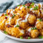 Freezing isn’t ideal for loaded totchos since the texture can suffer, but if you must, freeze the baked tots separately before topping them. Wrap tightly and freeze for up to one month. Avoid freezing once the creamy toppings are added.