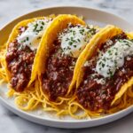 Grab your crunchy taco shells and carefully spoon the spaghetti and meat sauce mixture into each one. Don’t be shy—pile it high! Then sprinkle shredded mozzarella generously over the top for that irresistible cheesiness.
