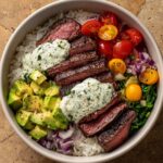 This Mediterranean Steak Bowl is a vibrant and nutritious meal combining perfectly cooked steak with fresh vegetables, quinoa, and flavorful Mediterranean sauces like hummus and tzatziki. Ready in just 20 minutes, it’s an ideal dish for a quick, wholesome lunch or dinner with a delightful balance of protein, fiber, and fresh ingredients.