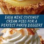 Delight in these Mini Coconut Cream Pies, featuring a smooth and creamy coconut custard nestled in crisp mini tart shells, topped with fluffy whipped cream and toasted coconut for a perfect bite-sized dessert.