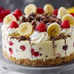This No-Bake Banana Split Cheesecake is a creamy, fruity dessert perfect for summer. Layers of smooth cream cheese filling alternate with fresh bananas, topped with pineapple, strawberries, walnuts, and a drizzle of chocolate syrup. It requires no baking, making it easy to prepare and delightful to serve chilled.