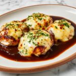 Alice Springs Chicken is a flavorful, restaurant-style dish featuring marinated chicken breasts topped with sautéed mushrooms and melted Colby Jack cheese. This recipe combines a tangy honey-Dijon marinade with creamy mayonnaise and lemon juice, delivering tender, juicy chicken with a golden crust and rich toppings baked to perfection. Garnished with fresh parsley and served with reserved marinade for dipping, it’s a hearty and satisfying meal that brings a taste of Outback Steakhouse to your home kitchen.