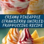 A refreshing and visually stunning Perfect Pineapple Strawberry Swirled Frappuccino that combines frozen pineapple and strawberries blended with milk and natural sweeteners, topped with whipped cream and freeze-dried fruit for a delightful, creamy summer beverage.