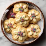 Pipe out your dough onto ungreased baking sheets in your favorite shapes—classic loops, rosettes, or even simple stars. Leave a little space between each cookie since they’ll hold their shape but spread just a bit while baking.