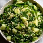 Next, grab a large salad bowl and toss in the chopped cucumber, celery, fresh or thawed green peas, baby spinach, and cooked quinoa. The mix of crunchy, soft, and tender ingredients creates a delightful texture combination that keeps each bite interesting.