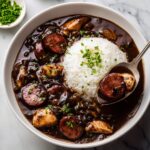 Before serving, sprinkle the chopped green onions or chives on top for a fresh, oniony crunch that lifts the dish. Your Savory Chicken and Sausage Gumbo Recipe is now ready to enjoy!