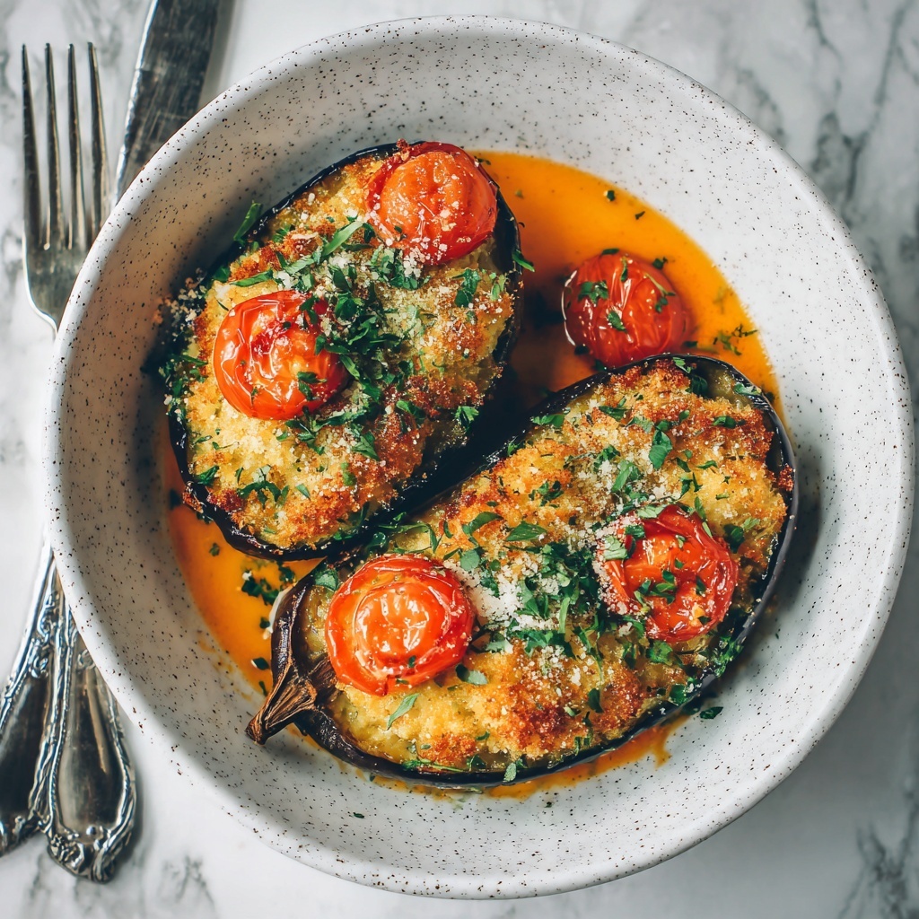 Savory Stuffed Eggplant is a flavorful Mediterranean-inspired dish featuring tender Italian eggplants filled with a hearty mix of ground beef, aromatic spices, and rice. Baked in a rich tomato and garlic broth, this meal offers a satisfying balance of textures and robust flavors, perfect for a comforting dinner that serves six.