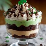 Celebrate St. Patrick’s Day with this festive Brownie Trifle featuring layers of rich homemade or boxed brownies, creamy instant chocolate pudding, and fluffy whipped topping, topped with green sprinkles and semi-sweet chocolate chips for a delightful treat perfect for parties and gatherings.
