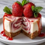 This Strawberry Swirl Cheesecake is a luscious and creamy dessert featuring a buttery graham cracker crust, smooth cream cheese filling, and a vibrant strawberry swirl made from fresh strawberries. Perfectly baked in a water bath to achieve a silky texture, this cheesecake makes an impressive treat for any occasion.