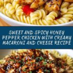 Sweet and Spicy Honey Pepper Chicken served over creamy macaroni and cheese. This flavorful recipe combines tender chicken breasts cooked in a honey-soy pepper sauce with a rich, cheesy macaroni base. Perfectly balanced with sweet, spicy, and savory notes, this comforting dish is great for a satisfying family dinner.
