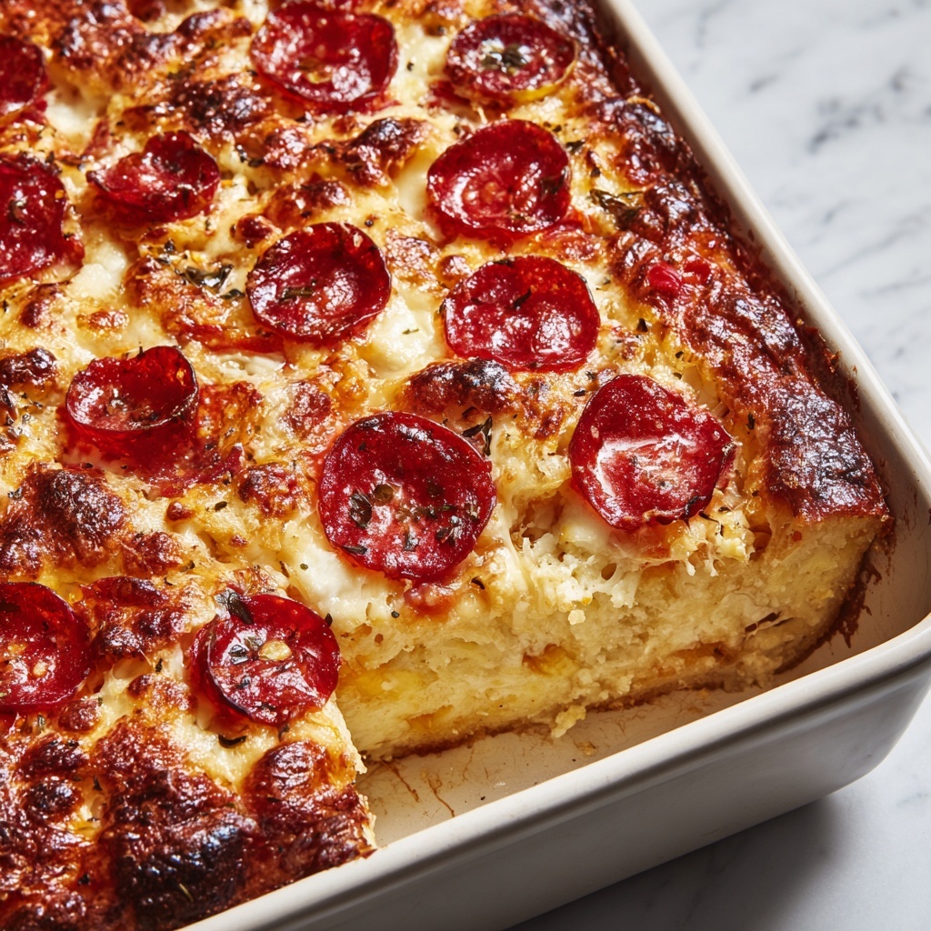 The casserole has a mild to moderate spiciness depending on the sausage and pepperoni used. You can easily adjust the heat by choosing milder meats or adding red pepper flakes for extra kick if desired.