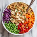 - Combine Ingredients: In a large mixing bowl, combine the cooled pasta, diced chicken, broccoli florets, shredded carrots, diced red bell pepper, cucumber, green onions, and cilantro.