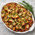 This dressing pairs beautifully with traditional Thanksgiving staples like roasted turkey, mashed potatoes, green bean casserole, and cranberry sauce. Its savory, herby profile complements these dishes perfectly and ties your entire meal together.