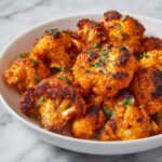 7. Toss the Cauliflower in Sauce: Remove the baked cauliflower from the oven and carefully toss the florets in the buffalo sauce until thoroughly coated.