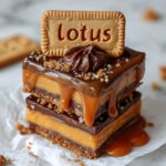 - Add Topping and Garnish: Pour the melted dark chocolate layer over the set biscoff fudge base. While still wet, crumble the lotus biscuits on top for texture and flavor. Return the pan to the fridge and chill for at least 30 minutes to set completely.
