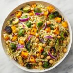 This vibrant Vegan Roasted Veggie Orzo Salad is a hearty, nutritious dish featuring tender roasted sweet potatoes, Brussels sprouts, and red onions combined with crispy chickpeas, toasted walnuts, and orzo pasta. Tossed in a zesty maple syrup vinaigrette with fresh herbs and dried cranberries, it’s perfect for a wholesome lunch or dinner served warm or chilled.